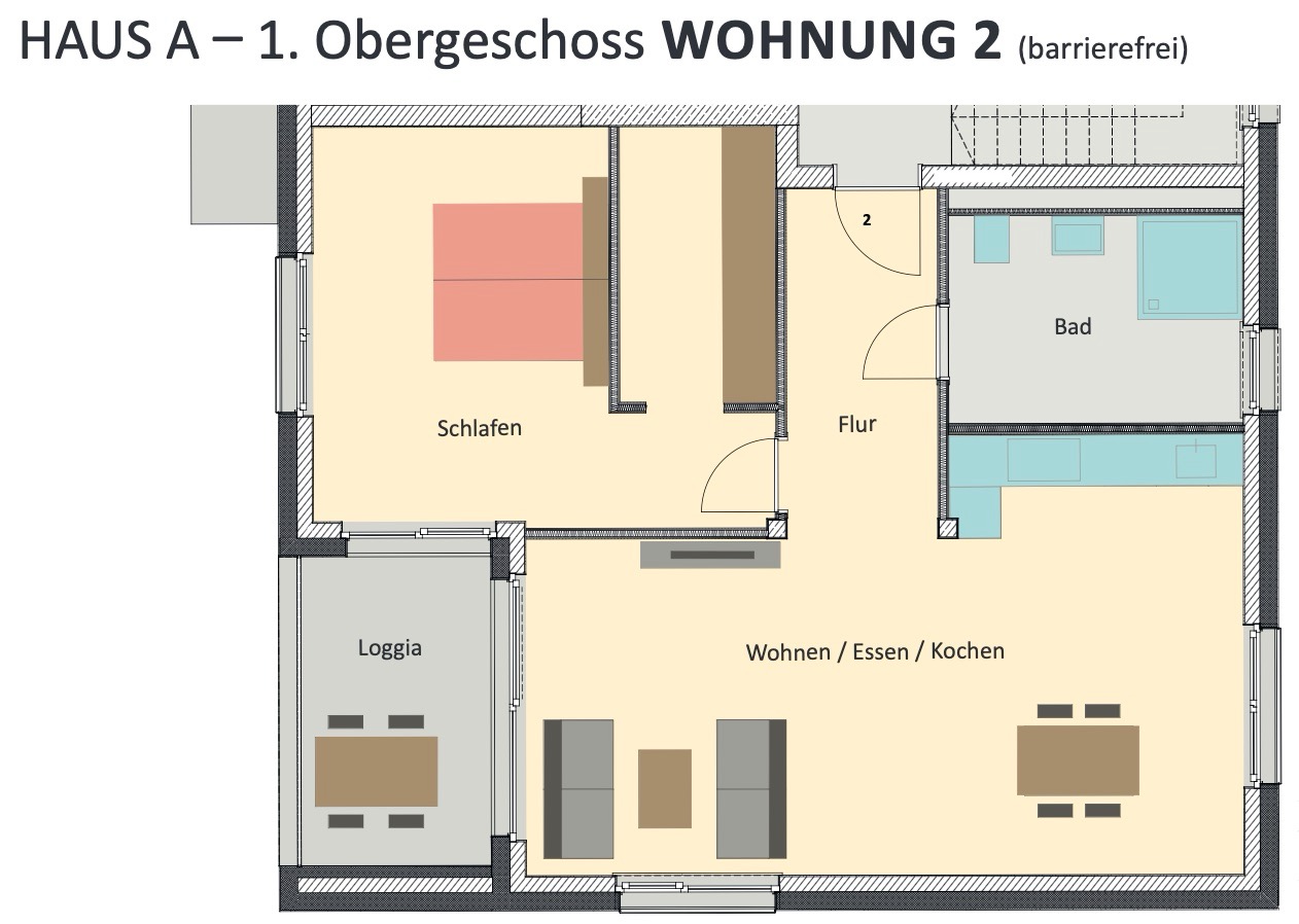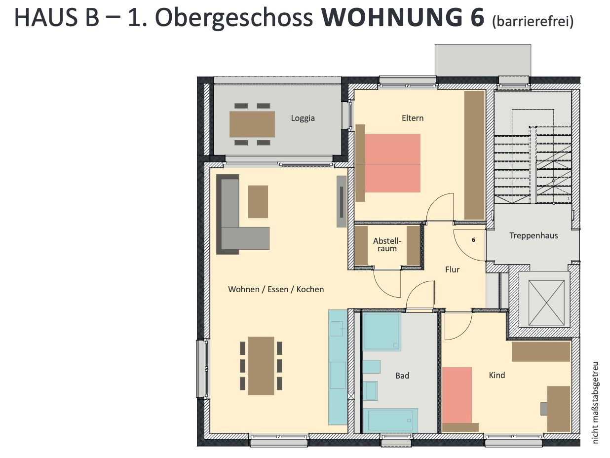 Großzügige Wohn- und Essbereiche bilden den Mittelpunkt vieler Wohnungen. Loggien, Terrassen oder Dachterrassen erweitern den Wohnraum ins Freie und schaffen private Rückzugsorte.