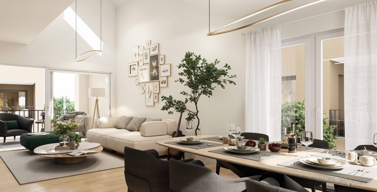 Großzügige Wohn- und Essbereiche bilden den Mittelpunkt vieler Wohnungen. Loggien, Terrassen oder Dachterrassen erweitern den Wohnraum ins Freie und schaffen private Rückzugsorte.